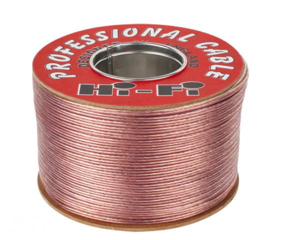 Przewód głośnikowy płaski (p) o żyle wielodrutowej i izolacji polwinitowej przeźroczystej. Jedna z żył oznaczona kolorem czerwonym