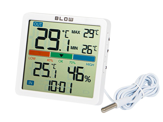 Duży ekran LCD z przejrzystym podziałem danych ułatwia szybkie odczytywanie wyników. Wyświetlane są temperatury, wilgotność, godzina oraz ikony komfortu wskazujące poziom wilgotności: LOW, OK lub HIGH. Dodatkowo urządzenie zapamiętuje maksymalne i minimalne wartości, co pozwala monitorować zmiany warunków na przestrzeni czasu.
